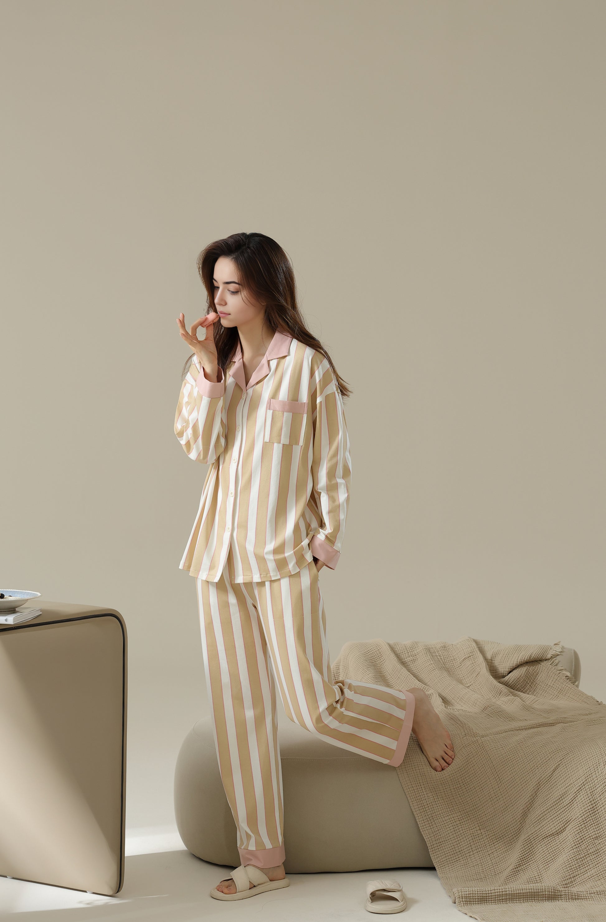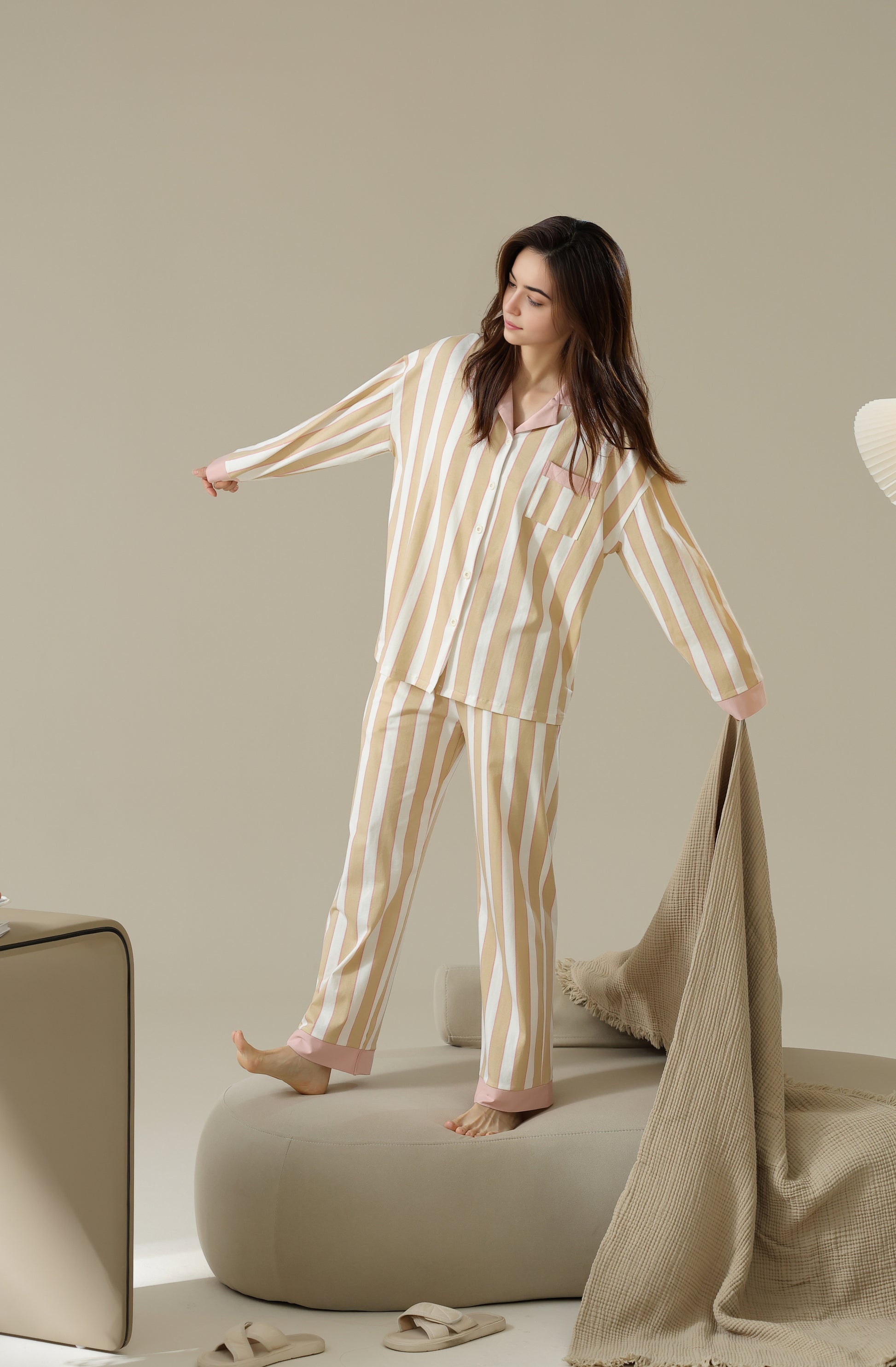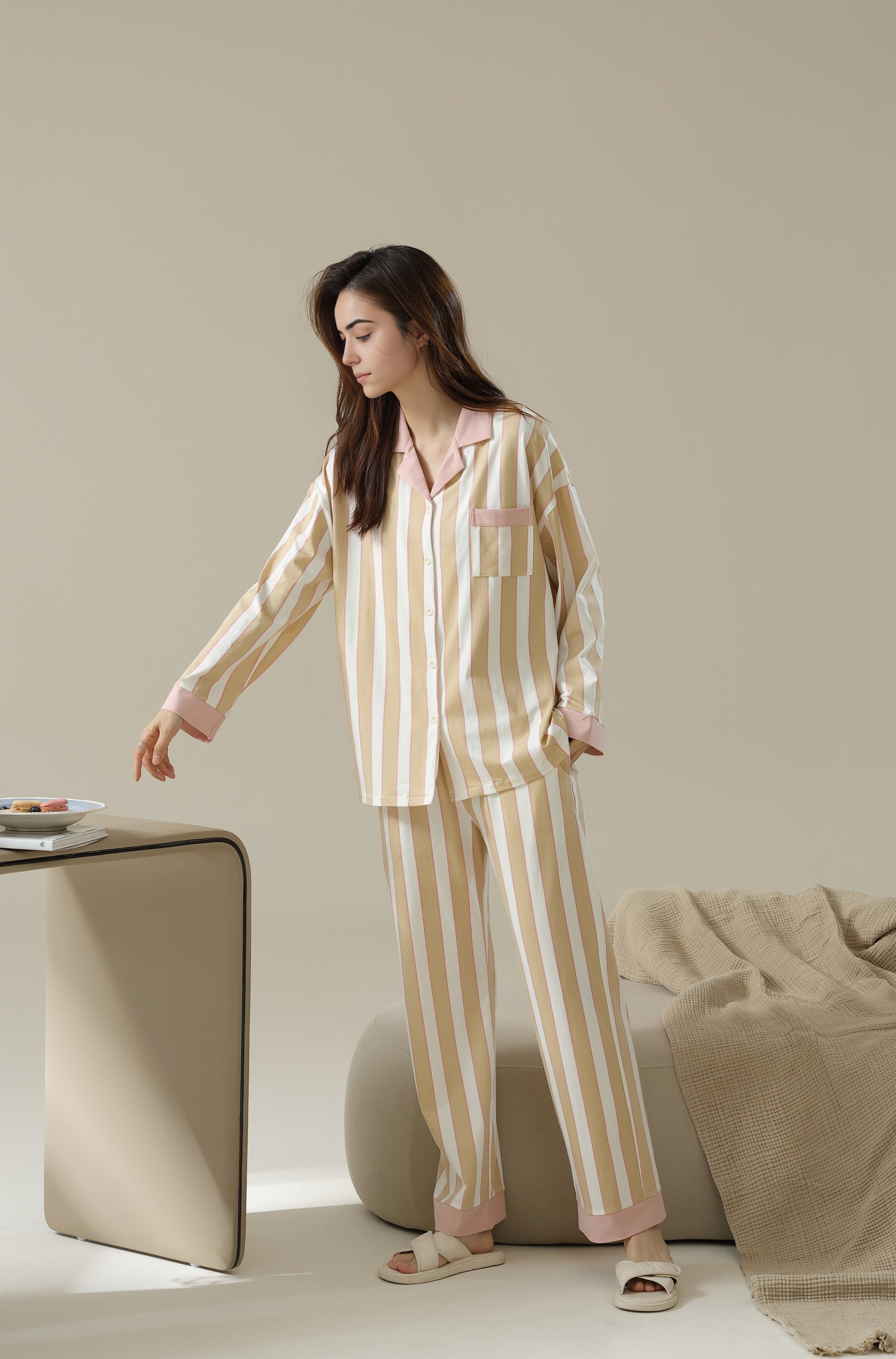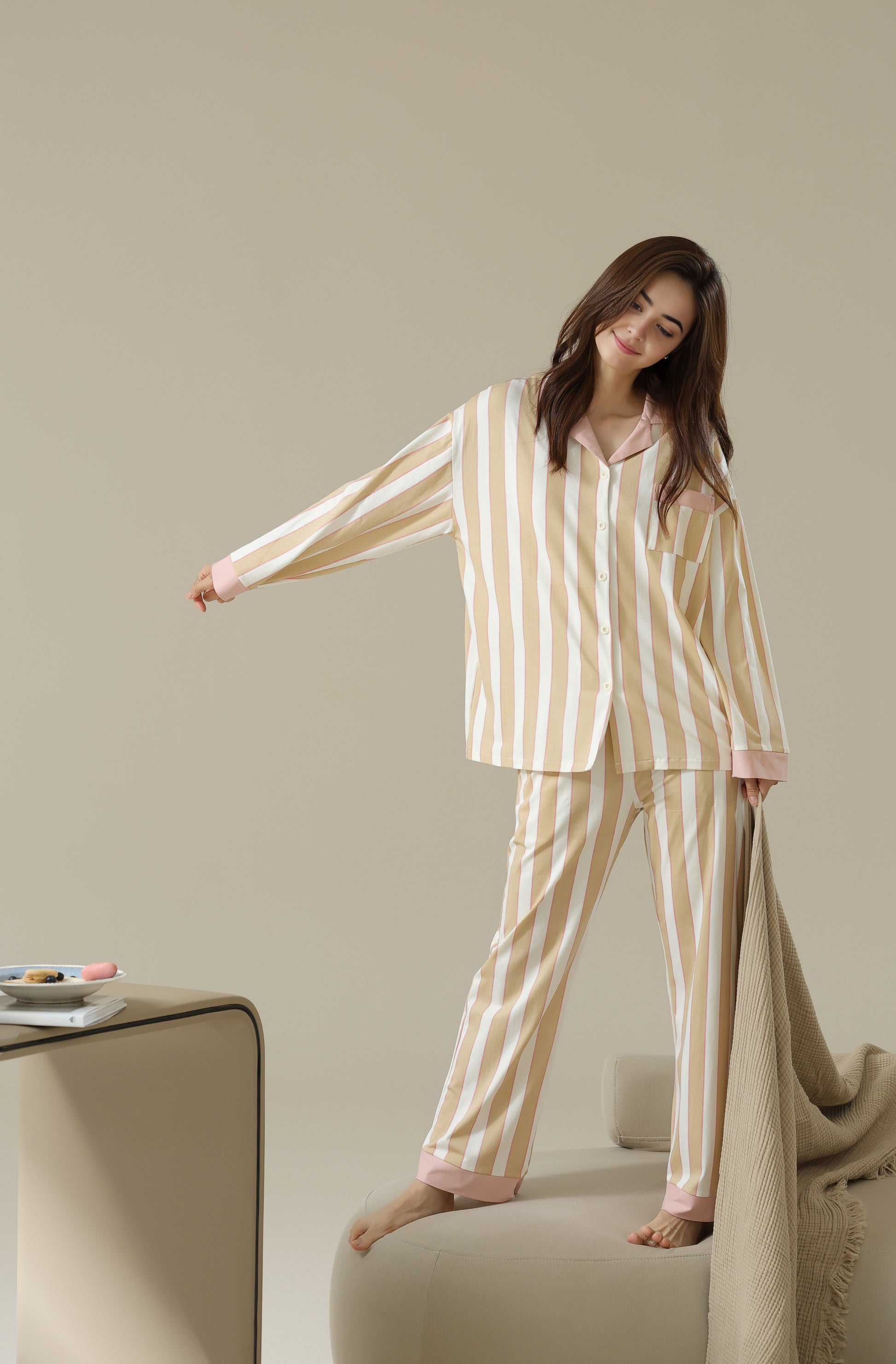 A stylish striped pyjama set offering a cozy fit with just the right amount of stretch for relaxation. Made from 96% cotton and 4% spandex.